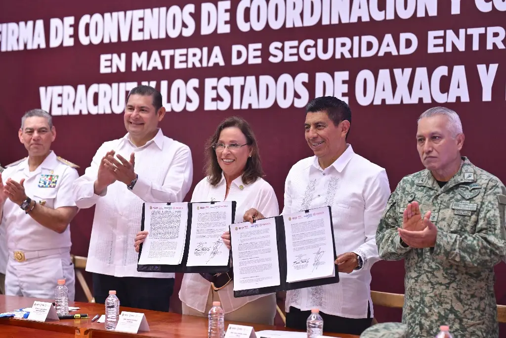 Este viernes la gobernadora de Veracruz, Rocío Nahle, firmó convenios de seguridad con sus homólogo de Oaxaca y Puebla, Salomón Jara y Alejandro Armenta, respectivamente.