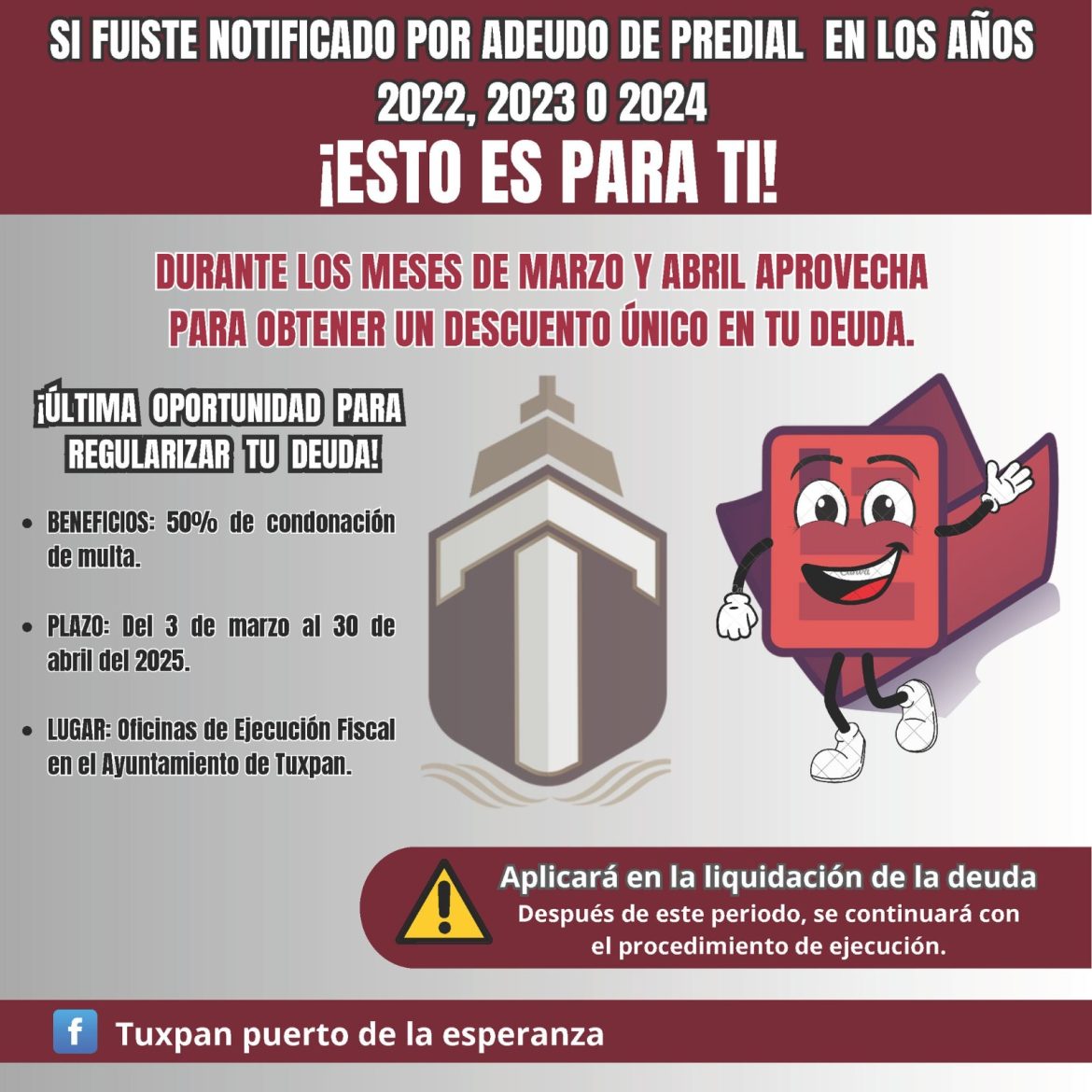 Tuxpan, Ver., 8 de abril de 2025.- Si fuiste notificado por adeudo de impuesto predial de los años 2022, 2023 y/o 2024, esta es tu oportunidad para regularizarte.