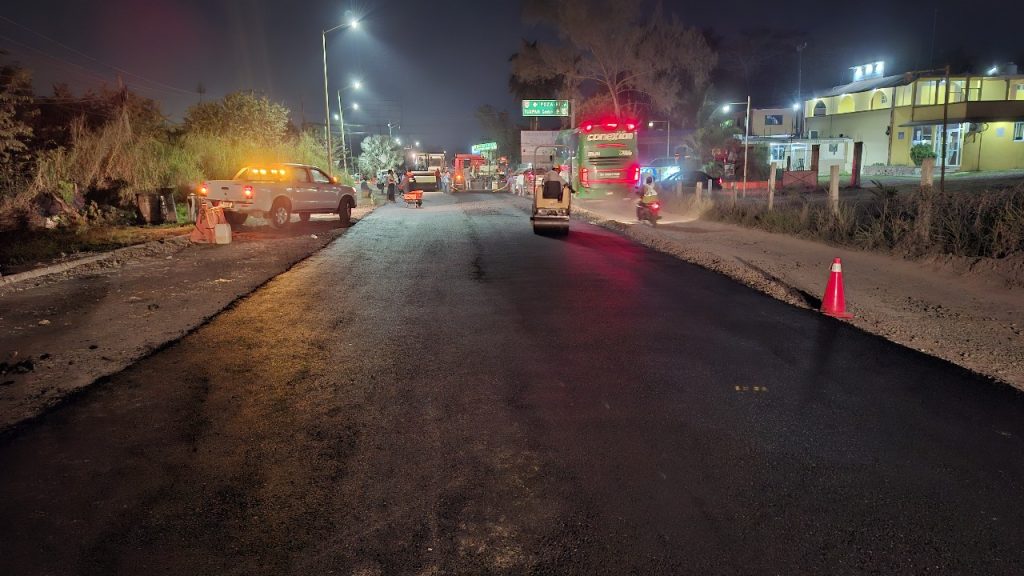Tuxpan, Ver., 4 de abril de 2025.- Obras Públicas del Gobierno de Tuxpan trabajó durante la noche en el asfaltado del acceso a la ciudad, a la altura de la UV, en la carretera Tuxpan-Tampico.
